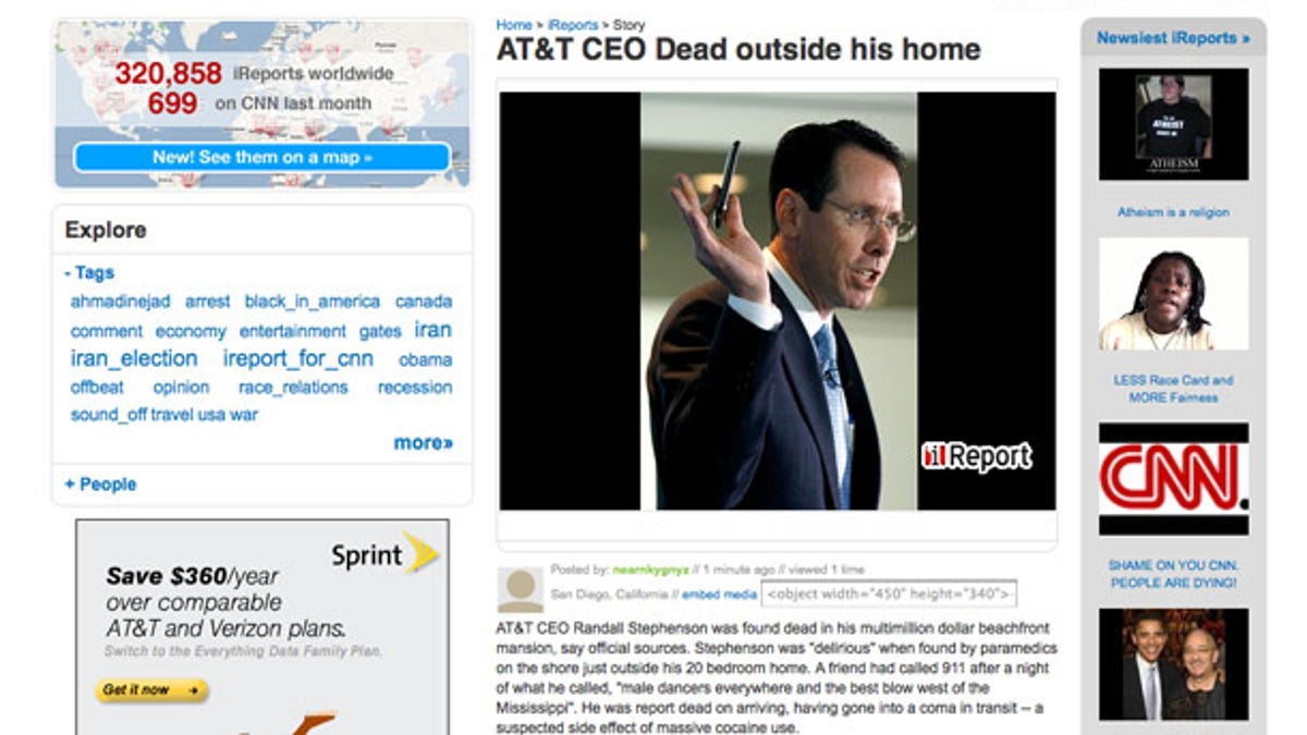 Last October, iReport was the victim of a prank in which a more believable user-submitted story reported that Apple CEO Steve Jobs--who has a well-publicized history of health problems--had suffered a heart attack. It wasn't true, but it was online long enough that Apple's stock took a dip.