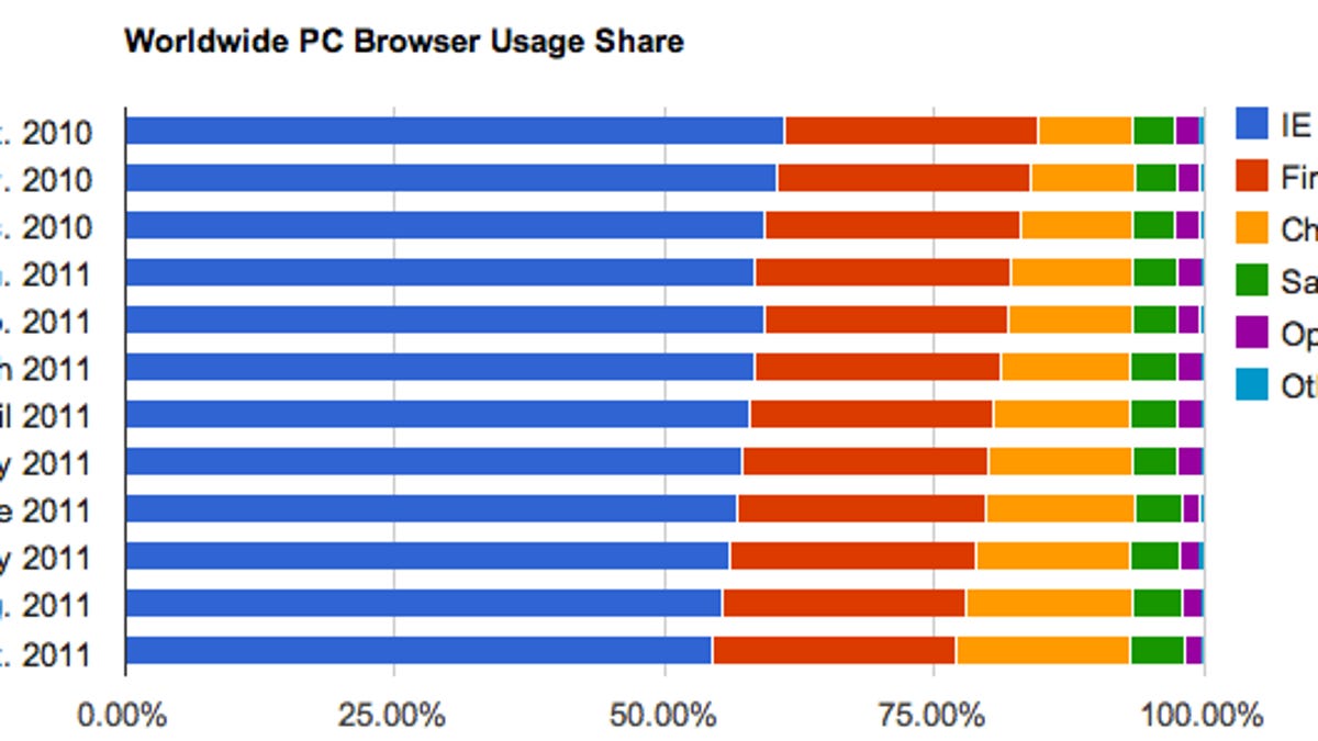 Both organizations' statistics show the same overall trend, though: Chrome's rise at the expense of Microsoft's Internet Explorer and Mozilla's Firefox. Note that those figures are in terms of percentages; because the overall market is increasing, a flat percentage still means growth in the absolute number of users.