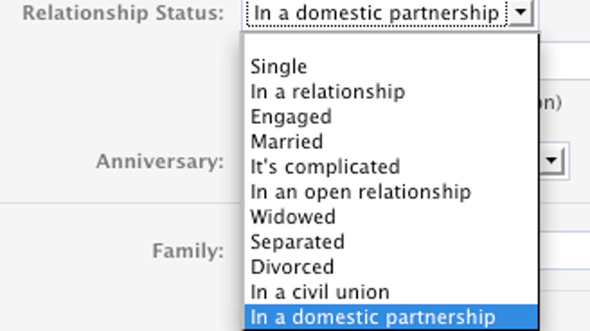 Facebook has long permitted members to put on their profiles whether they're single, married, or "it's complicated," but today it added two new options to the mix: "in a civil union" and "in a domestic partnership."