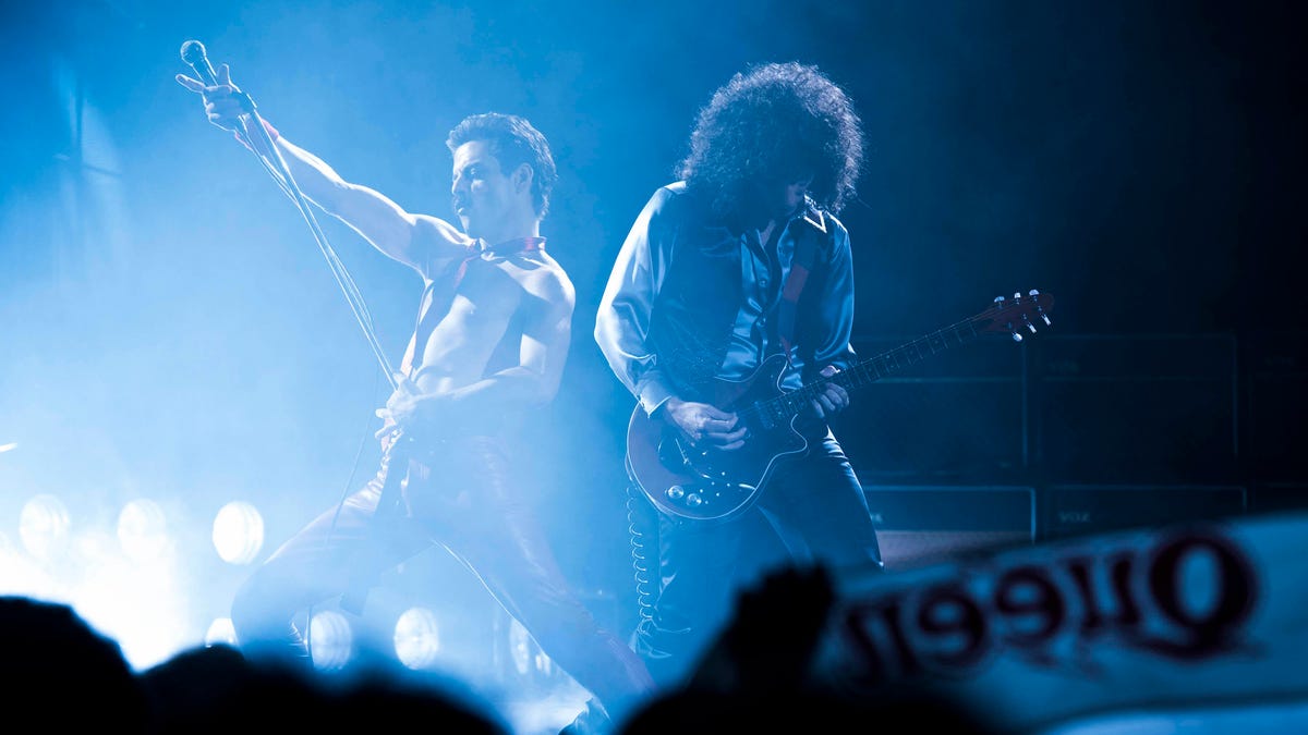 Gwilym Lee (left) as Brian May and Rami Malek (right) as Freddie Mercury performing Fat Bottomed Girls.