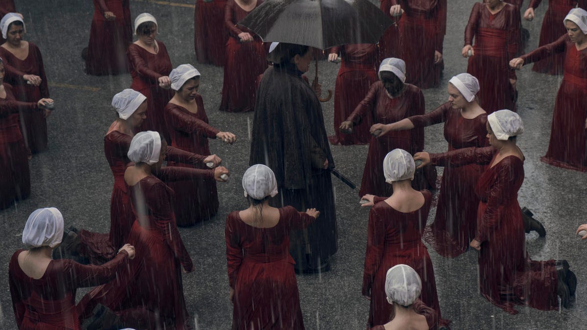 And this season, it's hard not to notice how stunningly artistic the scenes have become. There's a scene, shot from above, where the Handmaids in their red cloaks and white wings are all standing in a circle holding stones as punishment. The camera whirls above them in an eerie aerial view, and the rain falls on the women like daggers. It's just one of many beautifully shot segments that could be paintings if they didn't depict such horrors.