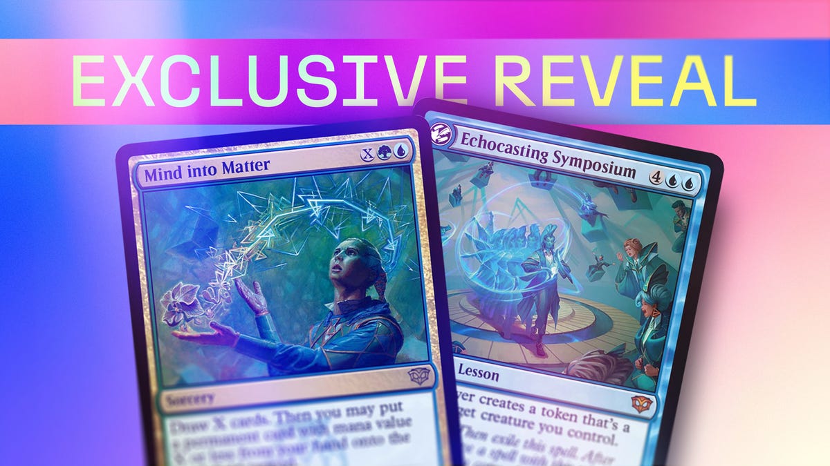 Both cards are also available in other treatments, with Mind into Matter getting a standard borderless version. Echocasting Symposium is available in the borderless field notes treatment -- one of only 12 cards from the set. The field notes art shows a Quandrix student sketching out how to create the copies with fractal magic.