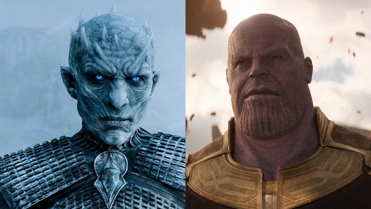 If you're a fan of Marvel and Game of Thrones, this past weekend was insane. After seeing the 3-hour Avengers: Endgame and then the hour-and-a-half Battle of Winterfell GoT episode, I couldn't help but compare their fantastic villains, Thanos and the Night King. OK, in GoT there are many villains and Cersei is probably the worst one. But the Night King and Thanos are more interesting to compare because there are so many similarities between them. Plus, I just want to see that fight.