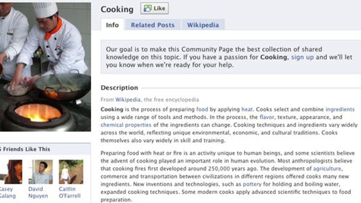"Community Pages" take the concept of a Facebook "fan page" and apply them to concepts, places, and ideas, rather than brands. An announcement at the top of Facebook's prototype community page for "cooking" explains that it aims to be "the best collection of shared knowledge on this topic," and sources quite a bit of content from Wikipedia. "You'll be able to learn more about a topic or an experience--whether it's cooking or learning a new language--and see what your friends and others in the Facebook community are saying about this topic," a post on the Facebook blog explains. "We're starting by showing Wikipedia information, but we're also looking for people who are passionate about any of these topics to sign up to contribute to the page. We'll let you know when we're ready for your help."