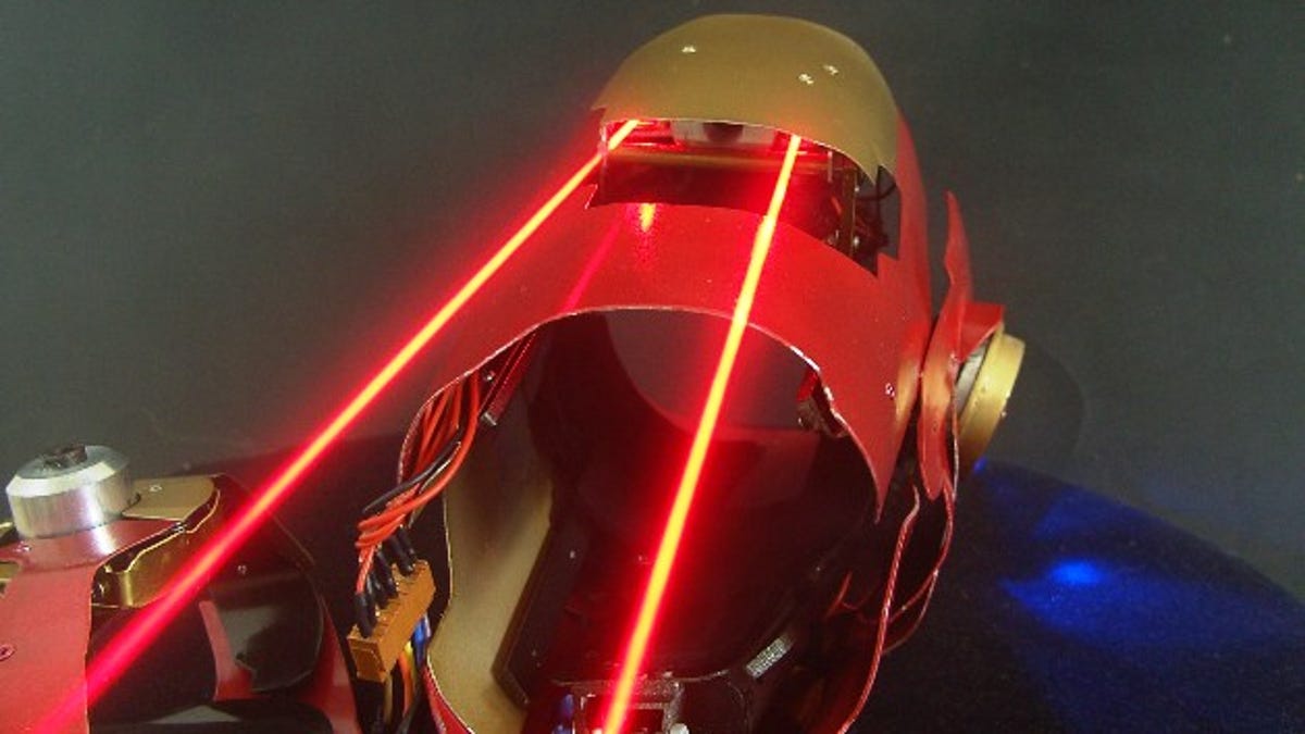 His latest creation is the Iron Man Laser Gauntlet, which fits over Priebe's forearm. It fires lasers, not anti-tank missiles.