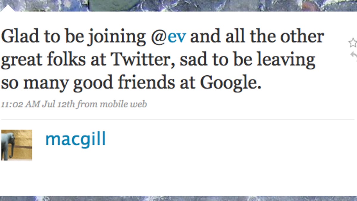 We're not ones to sound the alarms over an alleged rush of Googlers fleeing the company for the likes of Facebook and Twitter (these things ebb and flow), but this one is a notable departure. With Twitter communication playing an increasingly prominent role in international news and affairs, the small company clearly needs to have solid legal counsel on board. For Macgillivray, it's undoubtedly more responsibility with fewer resources than the likes of Google--but a bigger space in Silicon Valley's spotlight at the moment.