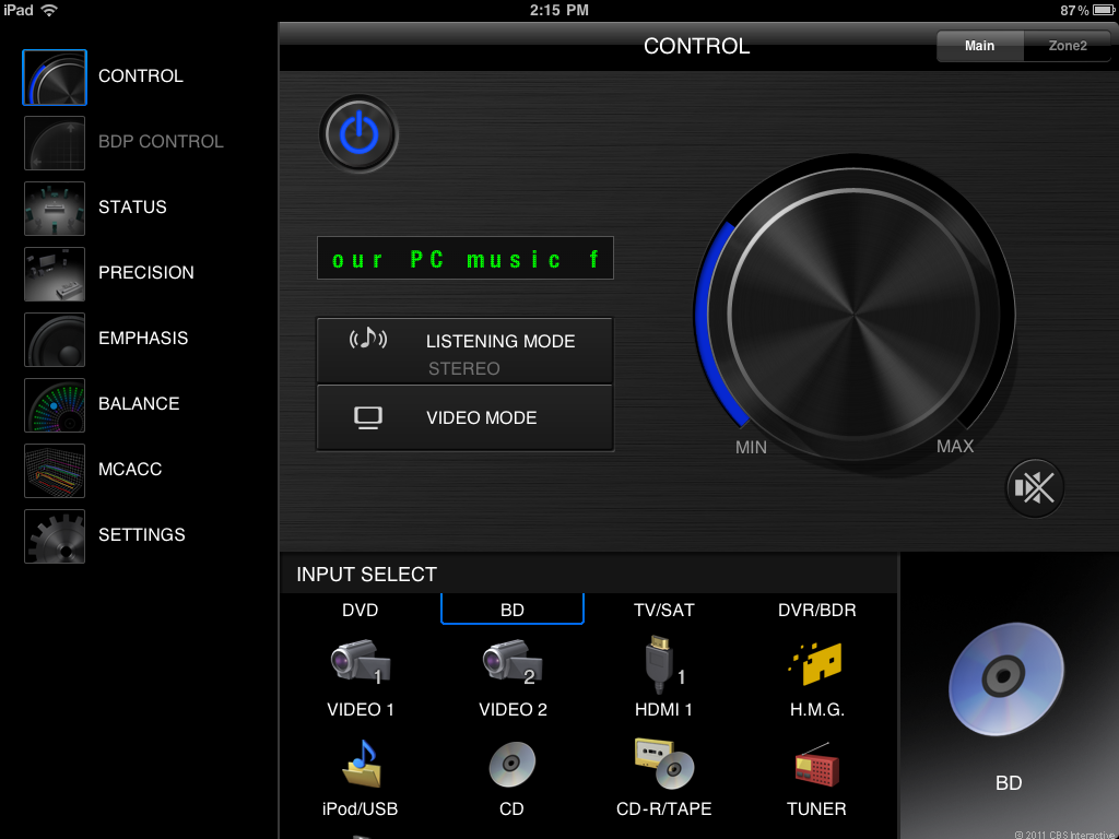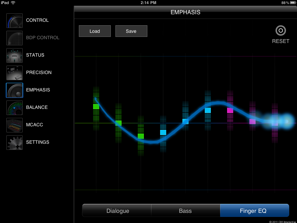 Pioneer also has a dedicated remote control app for the VSX-1021-K, called iControlAV2. The app looks great, especially on the iPad, but most the functionality feels gimmicky. The emphasize and balance sections let you alter the sound processing in various ways either tilting the iOS device or "drawing" an EQ curve with your finger, but we felt like it was difficult to control. It's easier and more precise to adjust those controls the old-fashioned way. It's definitely something that's cool to show off--especially drawing an EQ curve and hearing the difference nearly immediately--but it's just not that practical.