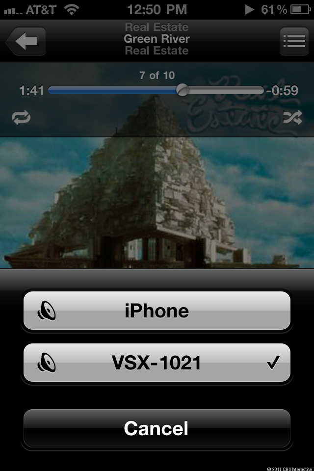 Once you get the VSX-1021-K on your home network (either via Ethernet or Wi-Fi, using the $150 adapter), streaming music from an iOS device (any iPhone, iPod Touch, or iPad) is as simple as playing a song, hitting the AirPlay icon, and selecting the VSX-1021-K. Music played using the iPod app will have full cover art and artist info displayed on the connected TV, plus you can adjust the volume of the receiver using your iOS device's built-in volume controls.
