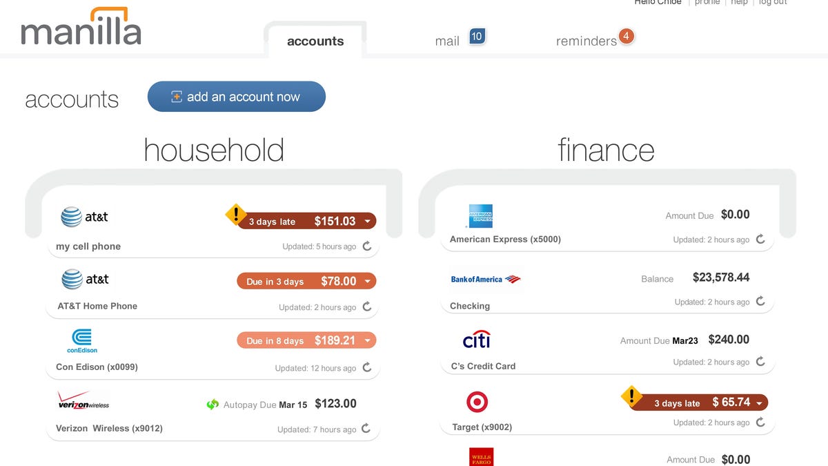 That's the point. Manilla is geared not toward the bleeding edge of technology enthusiasts, but toward the average American head of household, the person responsible for corralling the home's cable and phone bills, bank accounts, magazine subscriptions, and airline rewards programs. The online aggregator delivers alerts, handles statements and payments, and provides a simple management interface much the way Mint has done for bank and investment accounts--though there are no bells and whistles like Mint's goal-achievement program.