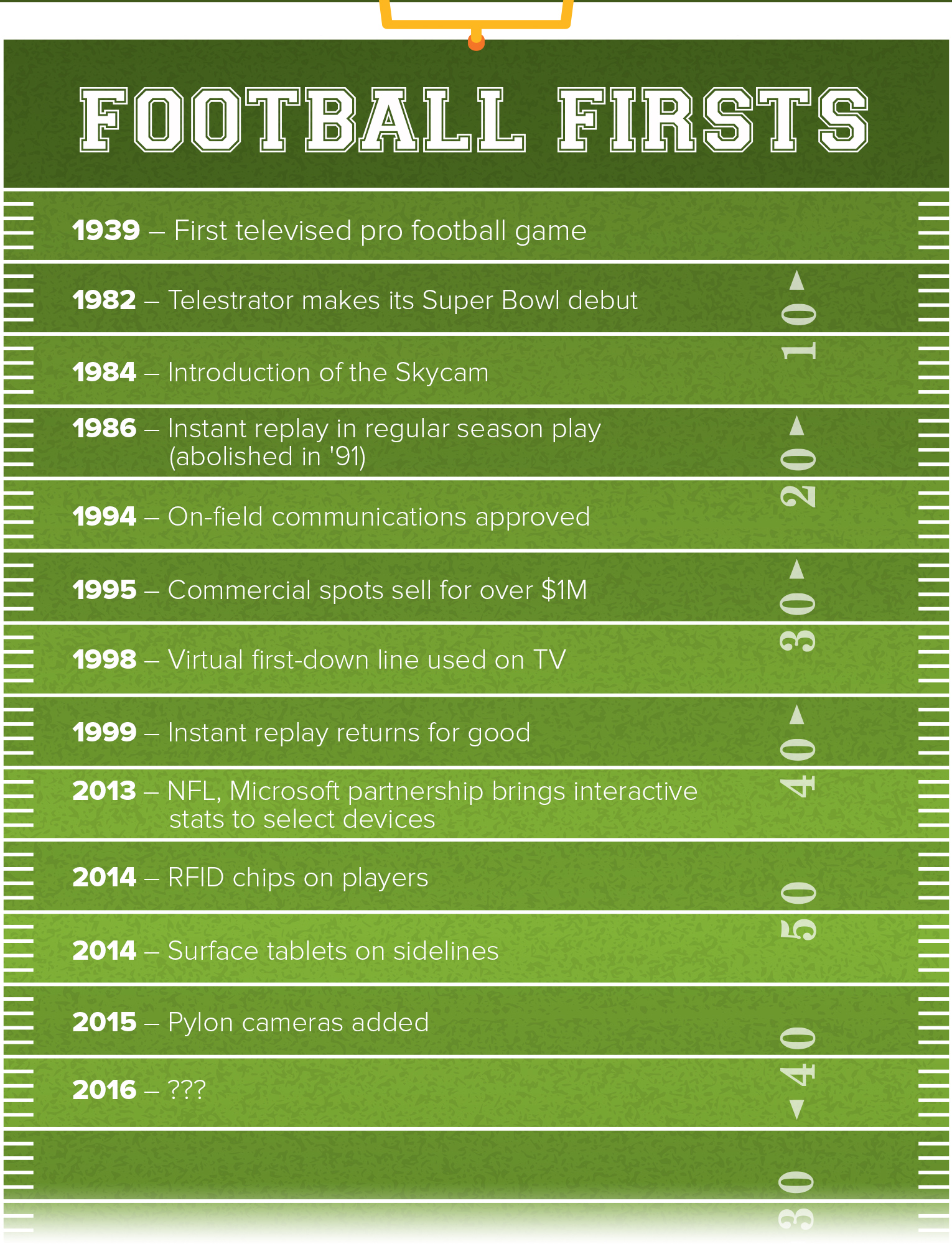 1998: The 1st & Ten line (yes, that virtual yellow line actually has a name!) was first shown on ESPN during a broadcast of a Cincinnati Bengals vs. Baltimore Ravens game on September 27, 1998. Today it's so ubiquitous going to an actual football game is a little confusing sometimes: "Wait, why is there no yellow line? How do I know where they are?"