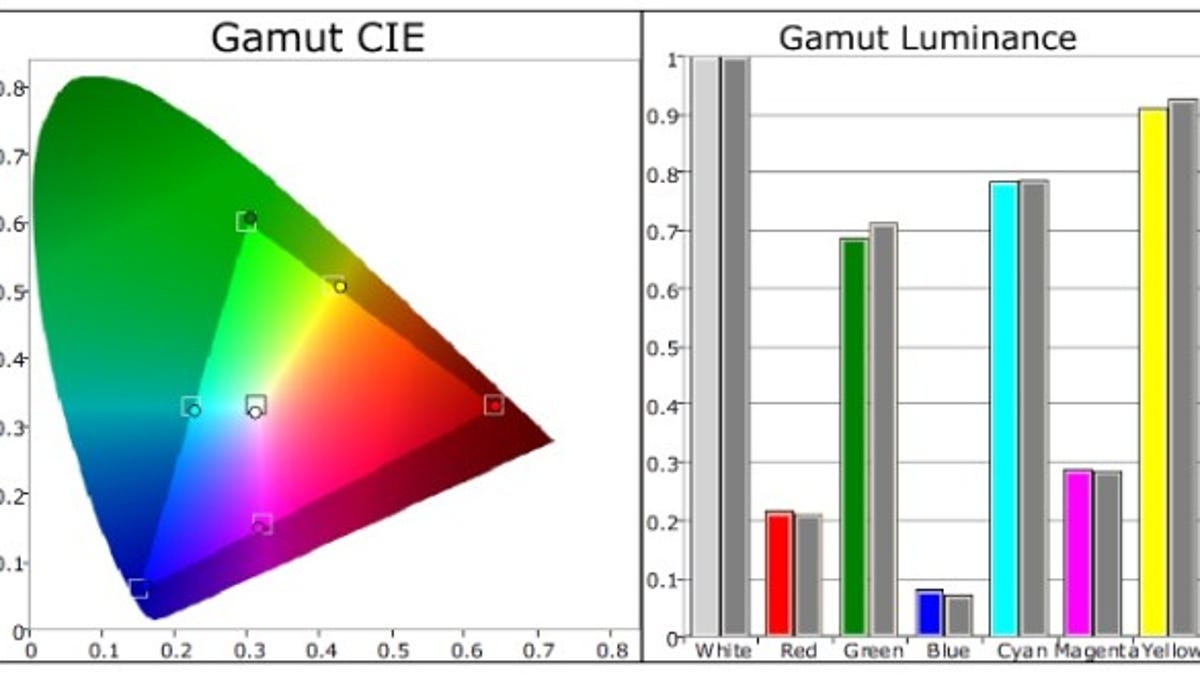 The gamut luminance chart shows the light level (luminance) of each primary and secondary color. The gray bars show the ideal, while the colored bars show the actual measured level. The closer each color is to the reference in level, the better--this especially important for the primary colors of red, green and blue. If there is too much red, for example, the TV is referred to as "pushing red." This can result in people with lighter skin tones having a reddish, sunburny complexion.