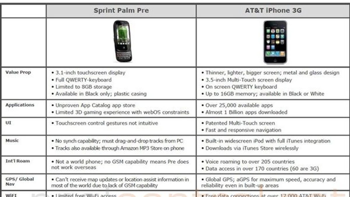As you may have seen by now, PreCentral.net got ahold of an internal memo from AT&T comparing its precious iPhone 3G with the Palm Pre, and not surprisingly, bashing the Pre as an inferior device.