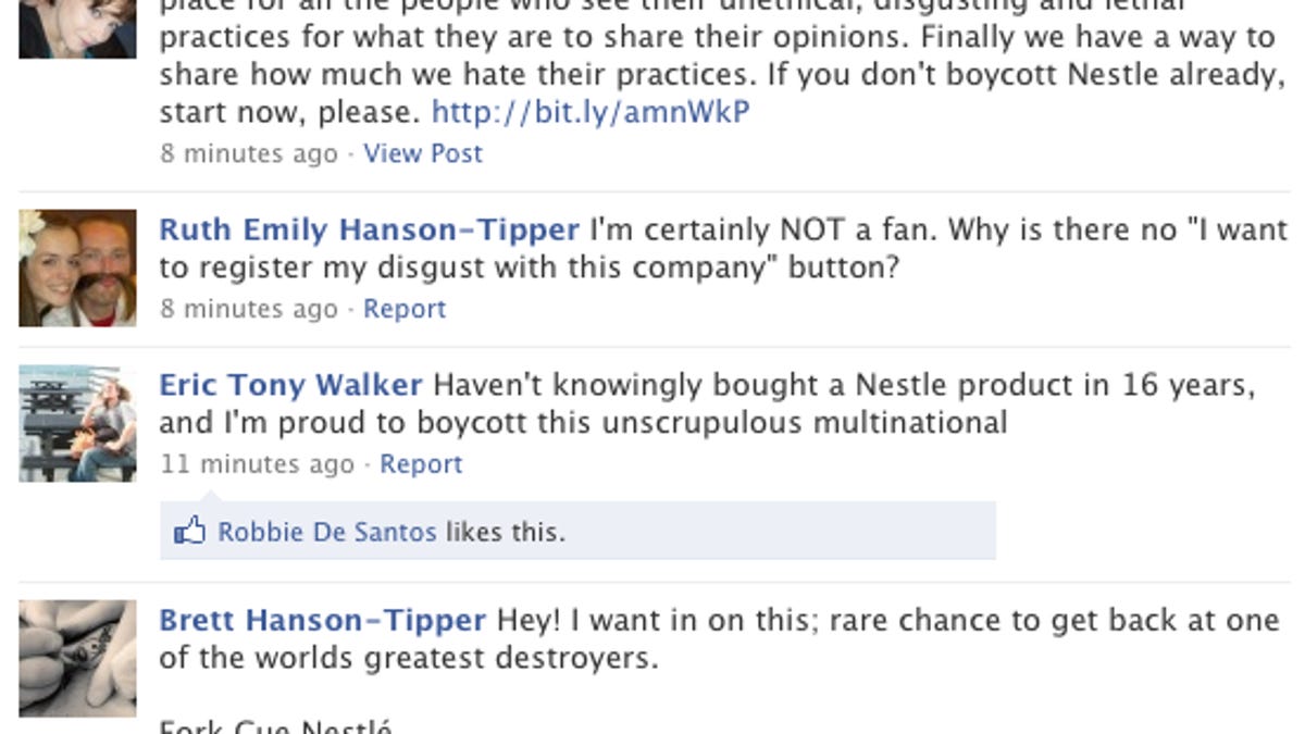 But this is the first time that we've seen such a massive blow-up in the comments of a Facebook fan page. Right now, the Facebook page is one of the hottest digital marketing tools out there, and brands hearing about the Nestle debacle are also seeing the downsides of operating such a public forum to welcome consumer comments. Whether this will be remembered as a single badly mismanaged user backlash or a pratfall of social-media marketing in general has yet to be seen.