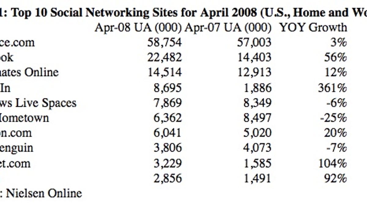 The April 2008 iteration of those numbers that Nielsen releases each month about social-networking site activity indicate that growth on News Corp.'s MySpace continues to slow, and that kiddie virtual world Club Penguin--acquired by Disney last year for $350 million--is just about static.