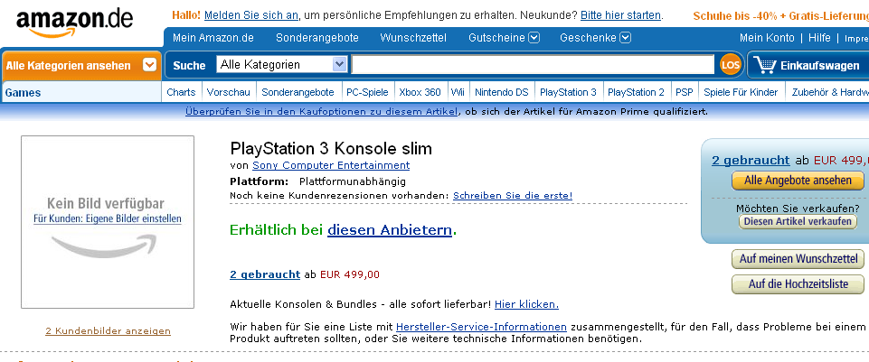 Take this for what you will, but a mysterious listing for a "Playstation 3 Konsole slim" has turned up on Amazon Germany. There's basically no info to go along with the listing except for an Amazon Standard Identification Number (ASIN). The picture that was added was from a user, who also added the 499 Euro price tag, so it's hard to tell whether this is a leak or something else.