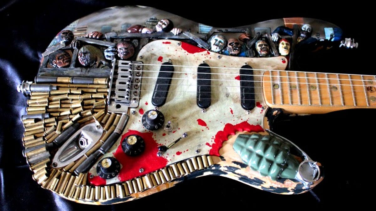 Guitar hacker Travis Stevens has made a significant contribution to collective self-defense against the coming zombie apocalypse. Along with zombie safe houses and survival kits, his Zombie Apocalypse Electric Guitar could prove a refuge and weapon of last resort.