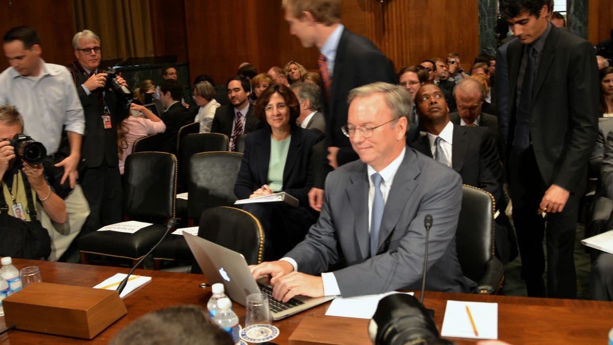 Minutes prior to testifying on Wednesday before a Senate subcommittee investigating whether Google stifles competition, Google's chairman sat down at the witness table to allow himself to be photographed. As cameras clicked, Schmidt decided to open a laptop.