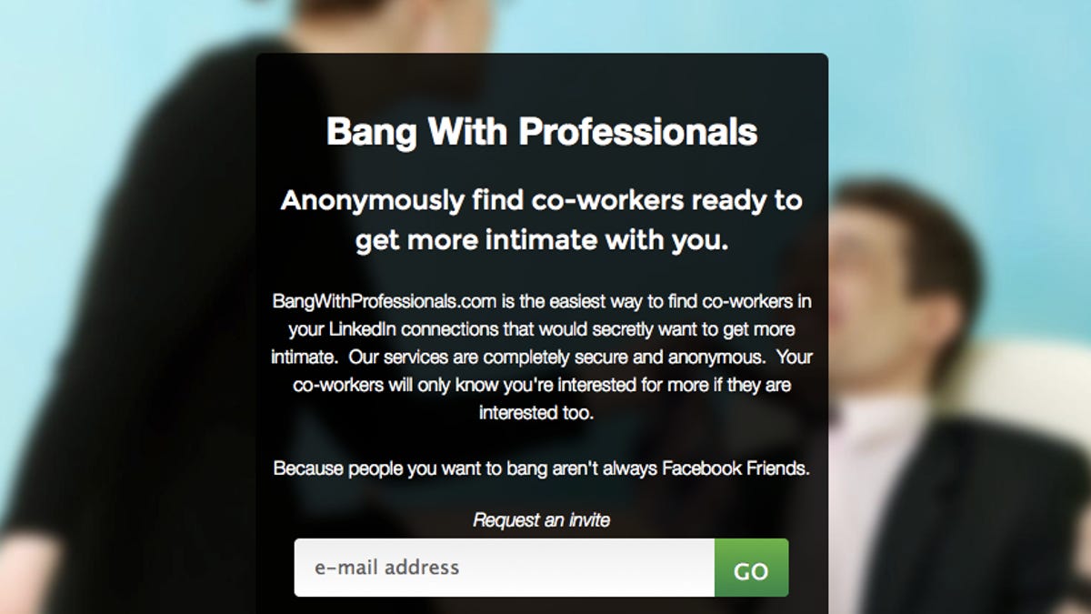 "Our services are completely secure and anonymous. Your co-workers will only know you're interested for more if they are interested too," the Bang With Professionals site says, perhaps removing the need for intervention by your human-resources department. I have attempted to make contact with Bang With Professionals with a nervous curiosity to find out more about what this workplace collaboration might entail.