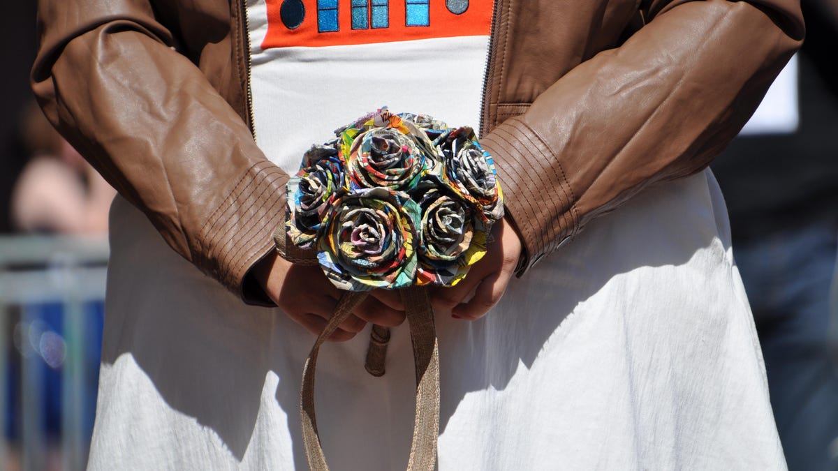 At one rear corner was an array of wedding accoutrements, from bouquets made from comic book pages to Lego bowties. The opposite side featured a wedding cake.
