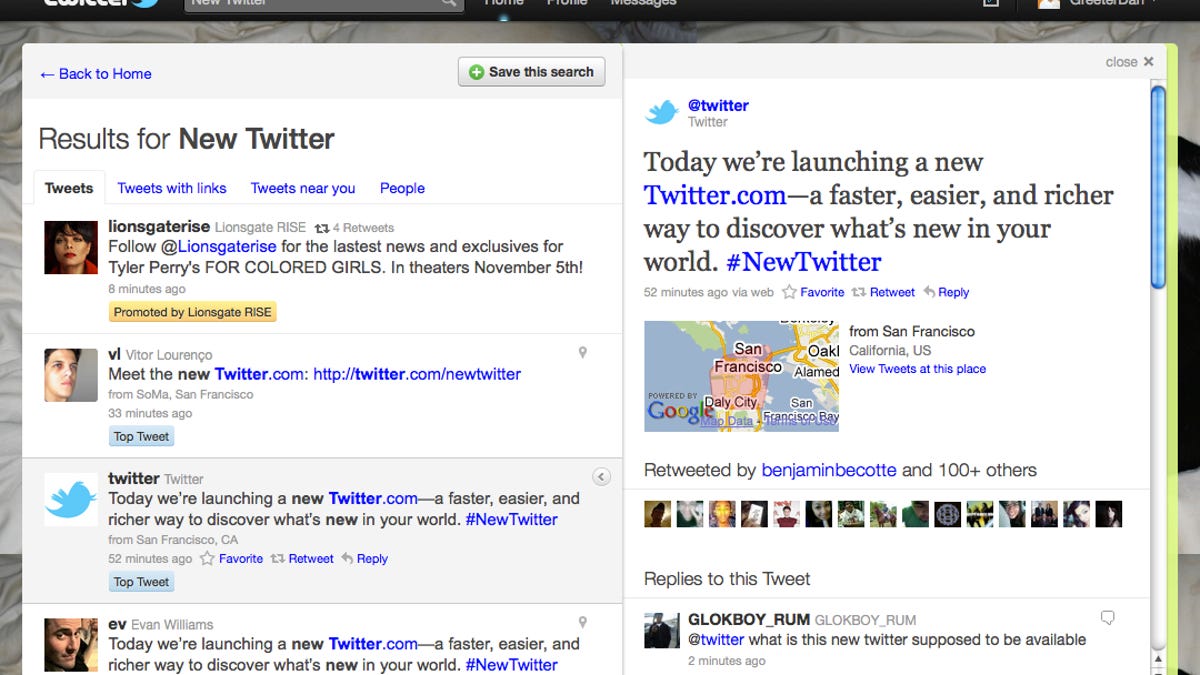 Though the new Twitter.com is launching Tuesday, Williams and other Twitter executives said the company had been experimenting with it internally--and with small groups of external testers--for months. And while some of the features are similar to Twitter's new iPad application, the Web redesign was started first, Williams said.