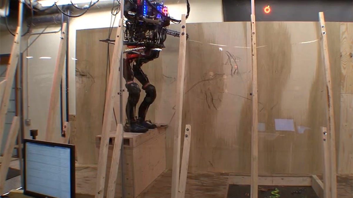 In the clip, the Pet-Proto robot -- a predecessor to DARPA's Atlas robot -- traverses a simulated hallway containing a very tall step and a thin walkway. Pet-Proto easily uses its strong arms to balance itself as it climbs a step, then perfectly leaps down with a thud. The highly agile walker stretches its legs to continue its journey along the thin edges of a gutted hallway floor.