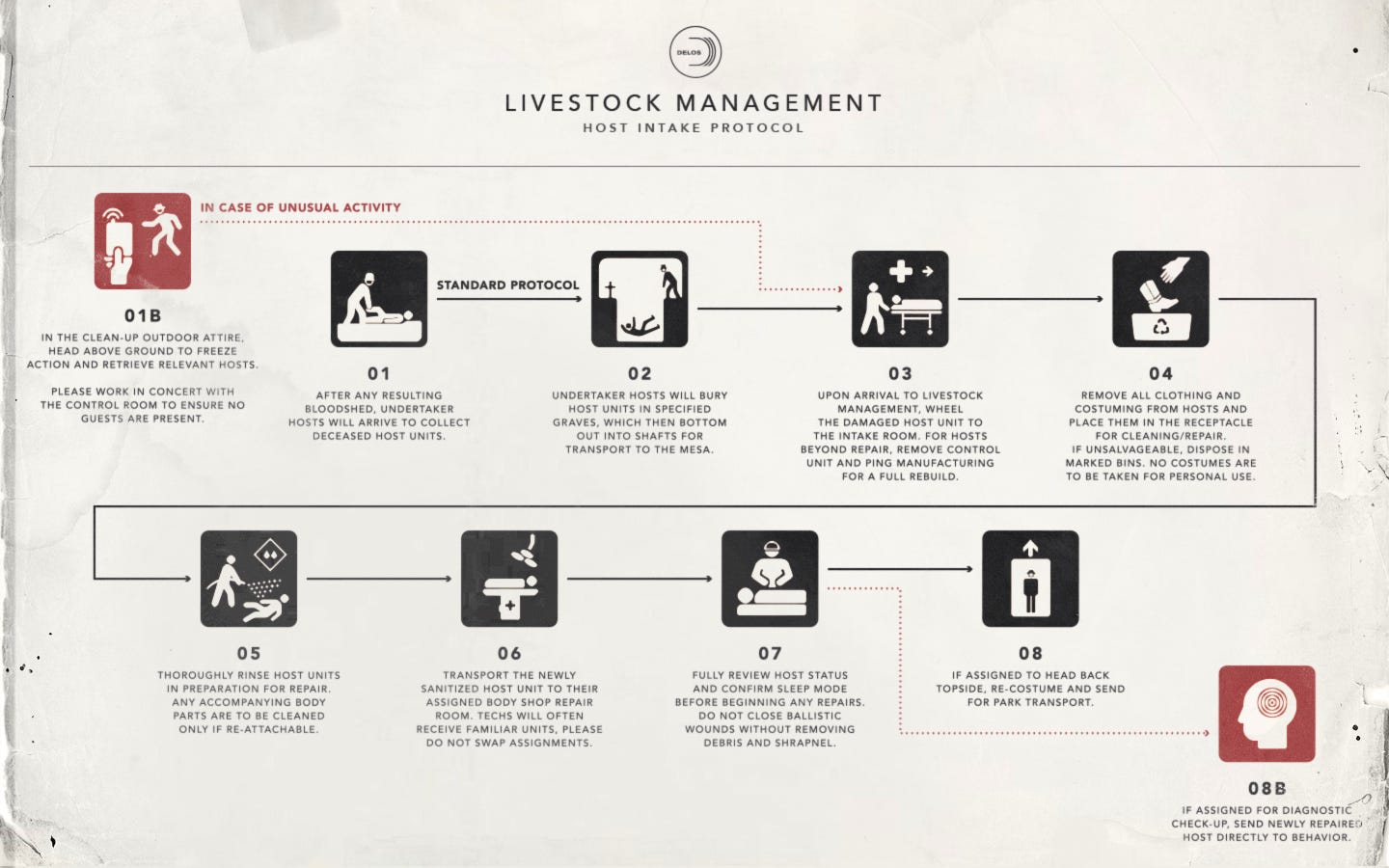 From these emails, we've gotten a lot of info that adds to the show; most recently, subscribers got a look at a Guest vs. Guest Training module (check out the image above). But there have been other reveals as the show aired (more on this below). There's also the creepy Host Intake Protocol information, a Narrative Development outline for Dolores, and a look at the offices and living quarters of Westworld's inner workings.