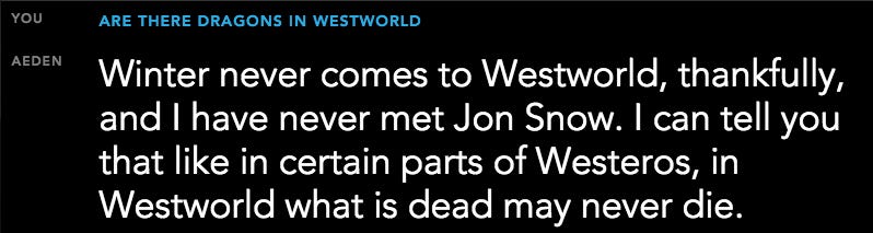 Try asking him who he is (try it three times in a row for extra creep factor), if he dreams, or about characters such as Dolores, Maeve or the Man in Black -- asking about Arnold, however, will yield a strange response. (Have you found any particular good or creepy entries? Let me know in the comments!)