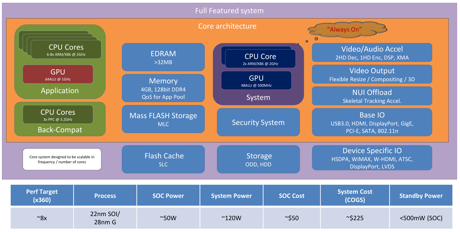 The leaked information goes somewhat in depth over a range of hardware specifics for the Xbox 720, with a blanket statement indicating up to anywhere between six to eight times the performance of the Xbox 360. An illustration on one page of the leaked document shows the supposed low-power (120W) architecture of the Xbox 720, code-named "Yukon."