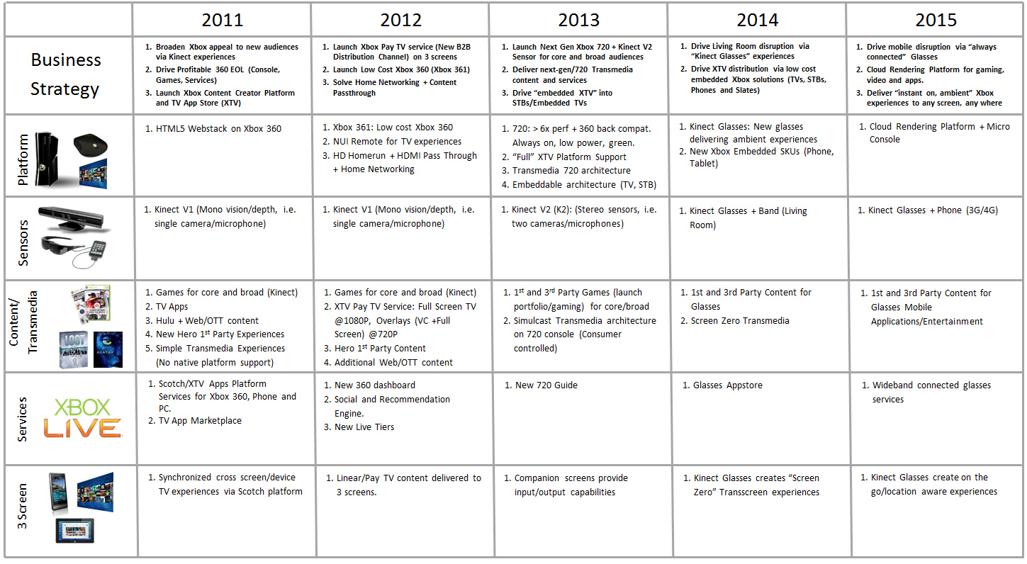 Supposedly crafted in 2010, the supposed Xbox product road map lists plans for 2011 and 2012, many of which did come to fruition (except for a pay TV service, but we still have a little more than five months left in the year). Things begin to heat up with the mention of a $299 Xbox 720 pegged around the 2013 holiday season, packaged with the second version of the Kinect camera accessory. Side notes suggest Microsoft could play the Xbox 720 for a 10-year lifecycle with a goal of 100 million units sold in that time frame.