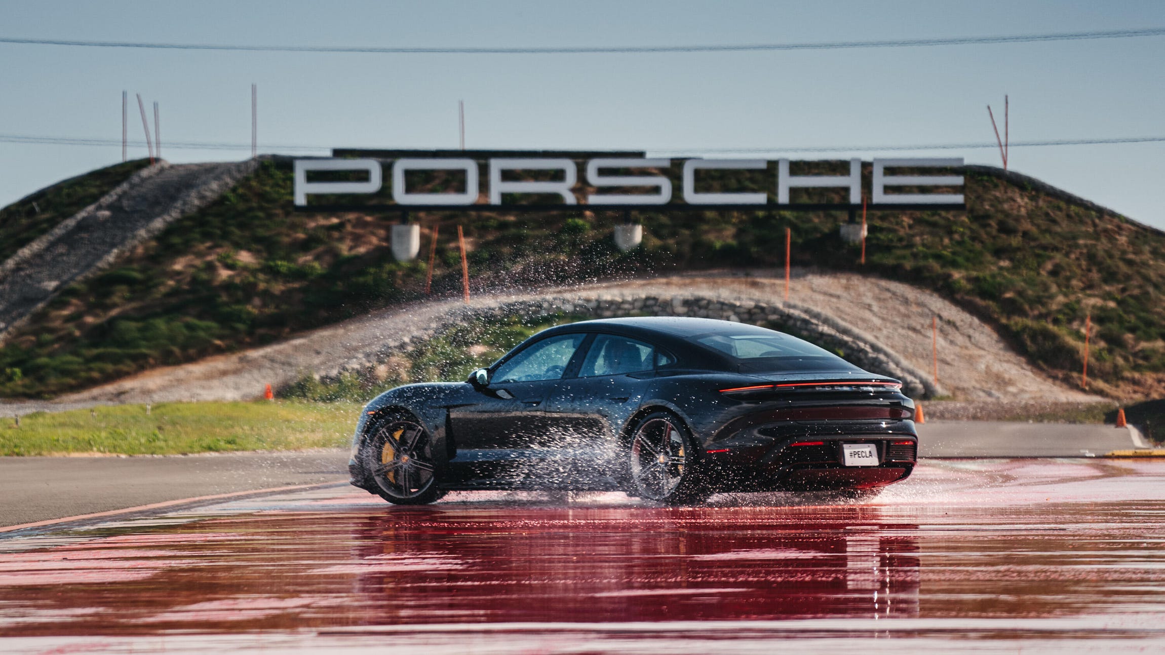 Taycan Turbo drifting in the wet at the Porsche Experience Center