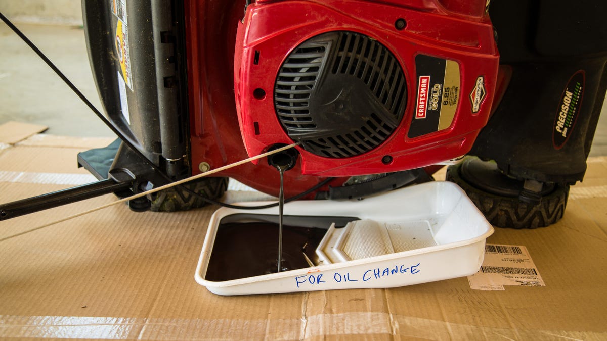 Drain the old oil from your lawn mower into a drip pan.