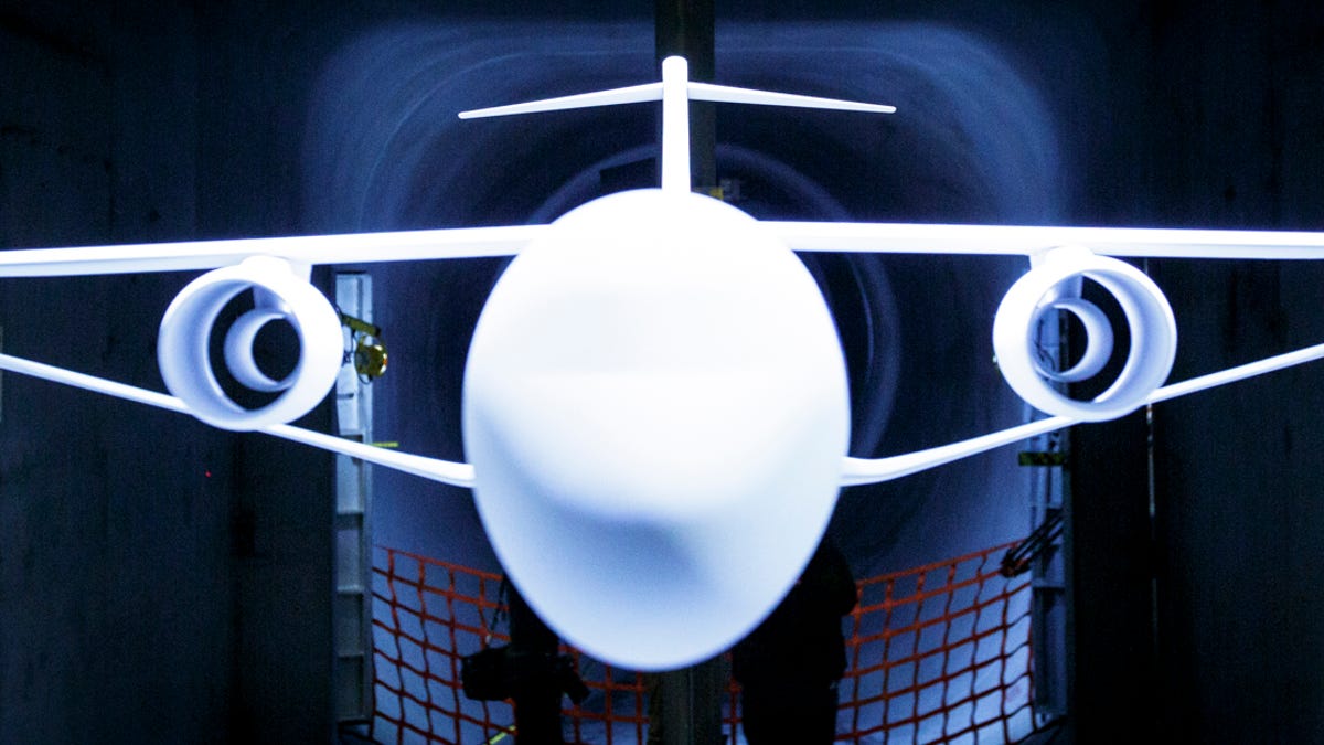 The American space agency gave reporters a glimpse of the future of commercial air travel from inside a wind tunnel last week at NASA's Ames Research Center in Silicon Valley. An all-white, windowless, 4-foot-long model plane with higher-than-usual wings was suspended in the tunnel where just last month NASA first began testing its design in winds exceeding the speed of sound.
