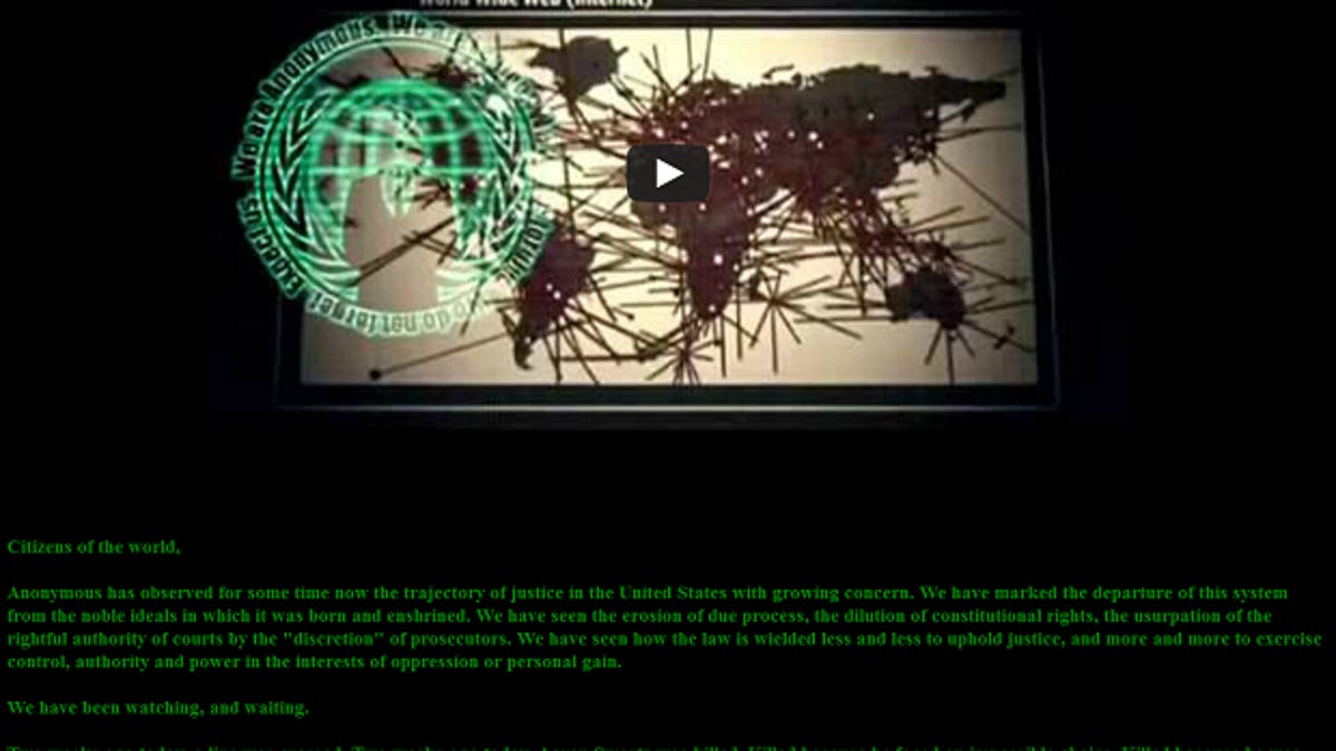 In response to the death of tech activist Aaron Swartz, hacktivist collective Anonymous hacked a U.S. government Web site related to the justice system and posted a screed saying it would begin leaking a cache of government documents if the justice system is not reformed.