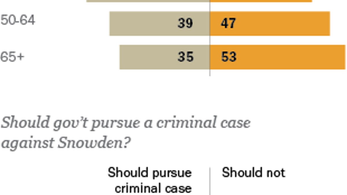 Young Americans might be willing to give Snowden the benefit of the doubt, but not so with older Americans. Those older than 65 were overwhelmingly against Snowden, with 53 percent saying that he "harmed public interest" and 61 percent saying that he should be charged in a criminal case. Americans between the ages of 50 and 64 aren't far off, with 47 percent saying that he harmed public interest and 63 percent saying he should be charged.