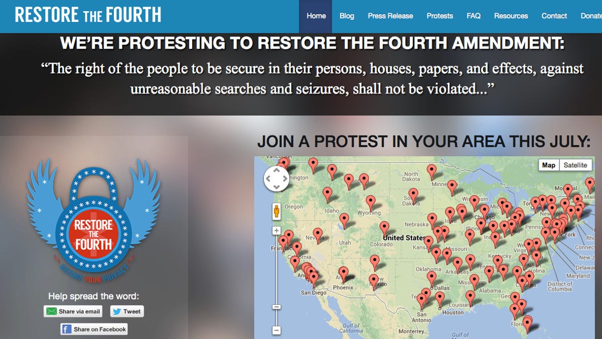 Additionally, site visitors will be asked to sign an online petition, e-mail Congress, or join street protests. A group called Restore the Fourth is organizing the street demonstrations in nearly 100 U.S. cities, including New York, Washington, D.C., and San Francisco.