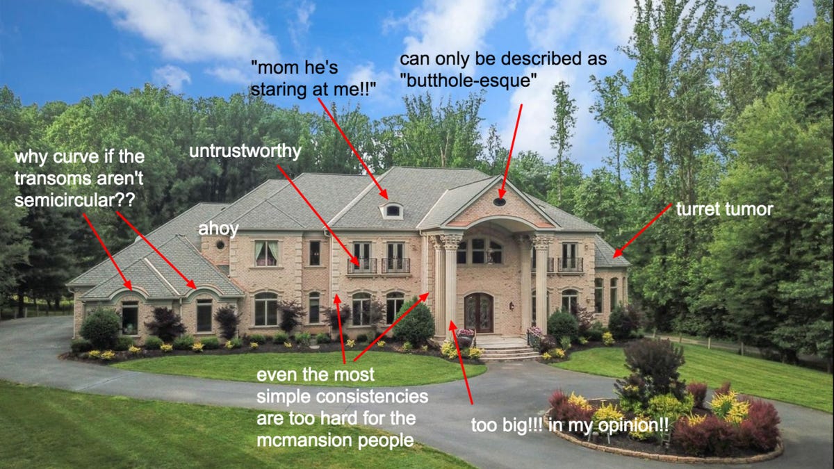 There's certainly no shortage of entertainment on McMansion Hell, which Wagner dedicates to skewering the most garish structures of suburbia. Though there's no textbook definition of a McMansion, Wagner listed the hallmarks of these houses "everyone loves to hate" both on her blog and in a 2017 TedTalk. Picture an oversized (typically more than 3,000 square feet) multilevel home designed in a mishmash of styles (maybe a Tudor-style roof over a Colonial porch) and with a complete disregard for such basic architectural principles as balance or rhythm. Superficial features like decorative columns, an overly-elaborate entry and a randomly placed turret are meant to show the occupant's wealth, but they can't hide the home's shoddy and mass-produced construction.