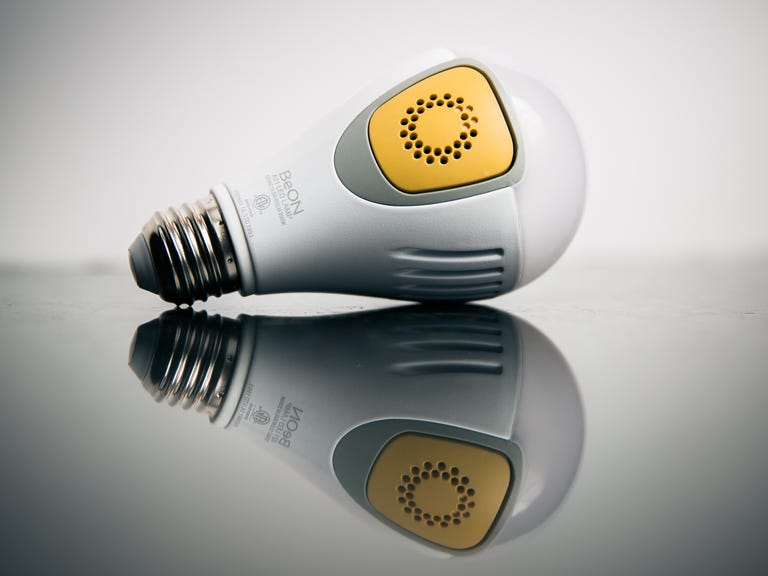 BeOn's pitch: a smarter smart bulb. Each one features a yellow module that pops right into the center of the bulb; that module includes a battery backup that'll let the lights shine without power, a microphone that listens for your doorbell or burglar alarm, and a Bluetooth radio that lets you sync things up with your smartphone. BeOn's bulbs learn your usage patterns, too. Tell the system you're away for the evening, and the bulbs will automatically "replay" your typical lighting changes to make it look like you're home -- no programming needed.