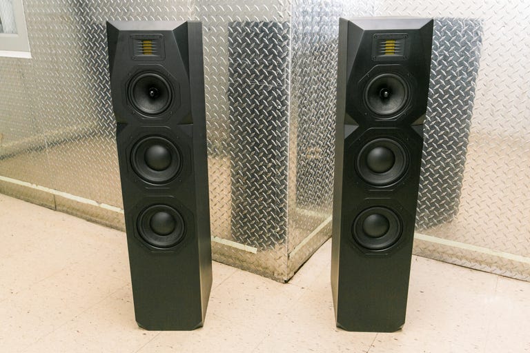 The Emotiva Airmotiv T1 floor-standing speakers feature a passive three-way design with a folded ribbon tweeter.
