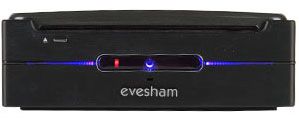 The front of the PC has a silver eject button, a bevelled Evesham logo and a translucent, elongated power button. This emits both blue and red LED lights, but the most impressive touch is a row of blue LEDs to either side of the button. These throb like the lights on KITT from the Knight Rider TV series as files are accessed from the hard drive. The effect is especially striking in the dark -- you won't want to hide the Mini PC away.