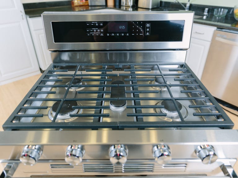Like other KitchenAid ranges , the KFDD500ESS makes use of a compact, minimalist design with an emphasis on straight lines. The front and top of the range are covered in ubiquitous stainless steel. The two cast-iron grates that cover the burners fit together to create a continuous cooktop that makes it easy to slide a pan from one burner to another. There are five burners on the cooktop; with the middle, oblong burner intended for use with the included cast-iron griddle. The control panel on the back of the range contains a digital display and a touchpad that controls the oven.