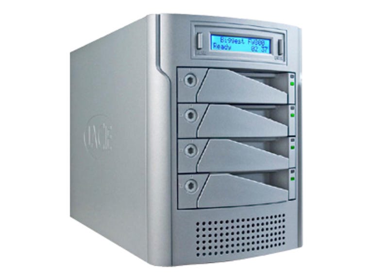 The LaCie Biggest FW800 is a four-bay external SATA RAID drive that supports several levels of RAID, hot-swapping, and a variety of connection options. It comes in two capacities: 1 terabyte ($1,050) and 2 terabytes ($1,530). Connection options include USB 2.0, FireWire 800, and FireWire 400 (using a FW400-to-FW800 cable). The included documentation walks you through the simple setup procedure, which does not require you to install drivers. A two-line text LCD sits on the front of the drive and relays information such as the drive's status and RAID level. Two LEDs on each drive bay blink or glow different colors, depending on the drive's status. The Biggest FW800 supports HFS+, FAT32, UNIX, and NTFS file systems, which makes it appropriate for various combinations of operating systems. The only major feature the FW800 lacks is a backup utility, which is odd, considering LaCie does have a proprietary utility in the form of the LaCie 1-Click Backup for Windows PCs and SilverKeeper for Macs.