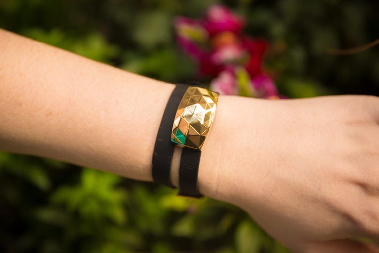 The June looks more like a piece of jewelry and less like a health tracker. The design is undeniably feminine, with a shiny metal jewel (Netatmo calls it a centerpiece) and thin wristband that wraps around your wrist twice. Netatmo compares the centerpiece's design to a diamond and indeed the metal housing for the sensor is faceted like a cut gem. There's a clasp on the black that slides onto the wristband and it can also attach to a pocket or shirt collar. The June comes in three colors, gold, silver and dark gray and I tested the gold model.