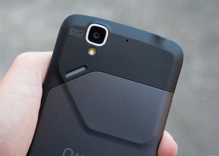 Above the screen is the front-facing camera. On the left and right spine are textured buttons for power and for the volume rocker. They're coarse to the touch, but eminently findable. The right spine is also home to the Micro-USB charging port. Up top is the 3.5 millimeter headset jack, and on the back sits the 8-megapixel camera lens. You'll have to pull off the back cover to access the microSD card slot.