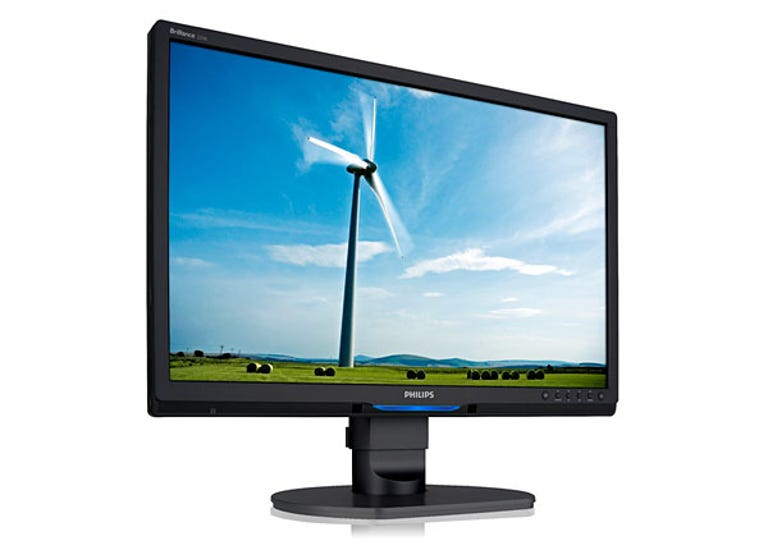 Two IR sensors at the bottom of the screen detect if a user is sitting in front or not, and dims the screen if no one is there. There is a blue power light directly under the Philips logo — thankfully, you can lower the brightness or turn it off altogether in the OSD. (Credit: Craig Simms/CBS Interactive)