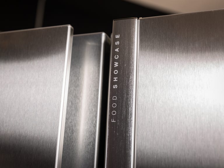 Of course, it's the eponymous Food Showcase feature that's front and center. Run your fingers along the recessed handle on the right, and you'll find that's separated into two sections. The top section pulls the fridge open per usual, but pull the lower "Showcase" section, and you'll open the fridge's front panel, exposing the in-door shelving (and the food held within) without opening the entire door.