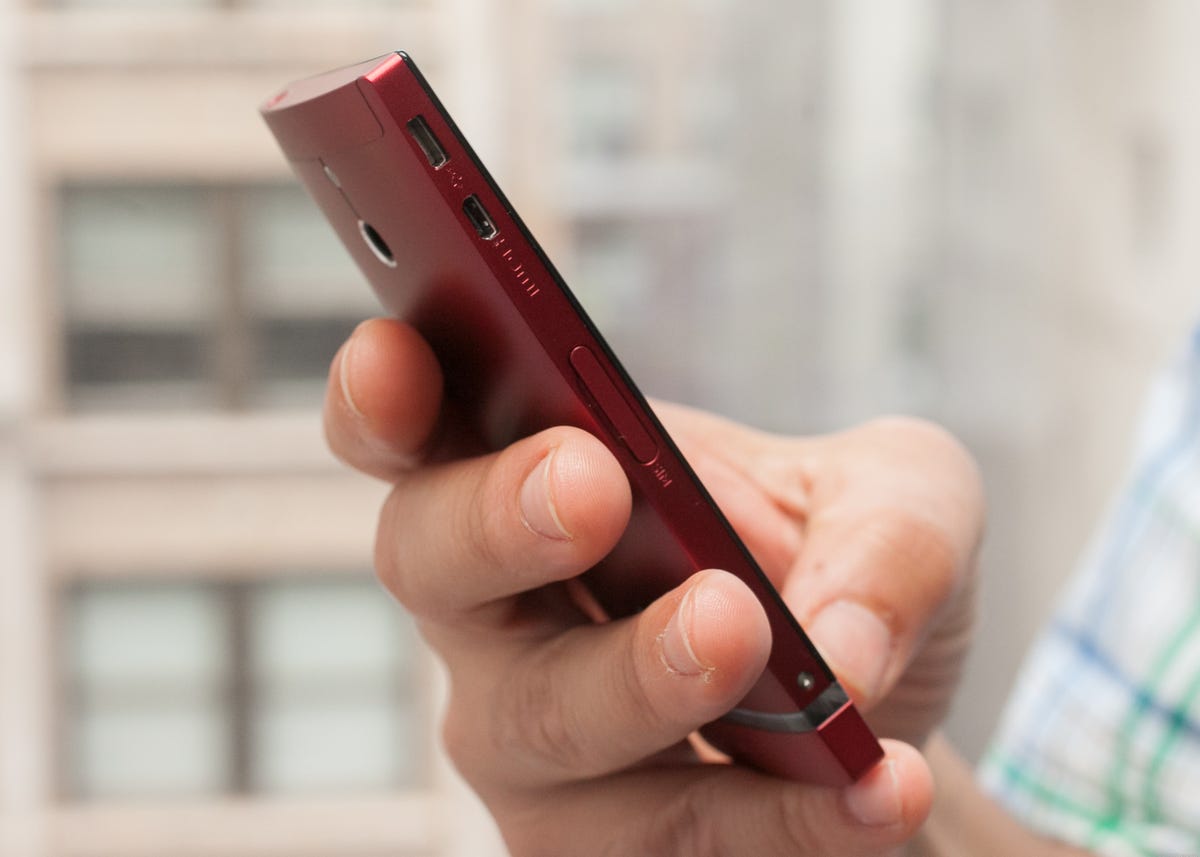 In front is a large 4-inch LCD screen with a qHD (960×540-pixel) resolution. Above the display sit a VGA front-facing camera and a notification light that changes colors depending on the alert. The left side of the phone holds ports for Micro-USB and HDMI, and a micro-SIM card slot covered by a flap. On top is a 3.5mm headphone jack, while the right side features a tiny power button. Also here are a thin volume rocker and a dedicated camera button that will launch the camera app and even wake the phone up from sleep. Around back is the phone's 8MP camera with LED flash.