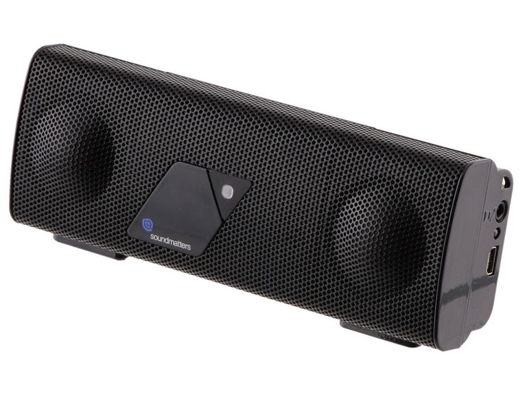 It's easy to mistake the v2 for the original model, since they look very similar except for a small "2" in the bottom right corner. The front of the speaker houses two proprietary 25mm dome speakers that Soundmatters calls the "Twoofer," because of its capability to produce both high and low frequencies while saving space. And although you can't physically see them, the v2 also uses four digital amplifiers that provide up to 97 decibels of aural power. The back of the bar has an on/off switch in the left corner, and two buttons on the right control the volume. You also get a kickstand that lets you position the speaker at an angle, and two rubber feet on the bottom support the unit during playback. Other convenient features include a Mini-USB port for battery charging, a 3.5mm line-in port, a power input jack for the five hour lithium ion rechargeable battery, and an LED status light that blinks to indicate power and Bluetooth pairing status.