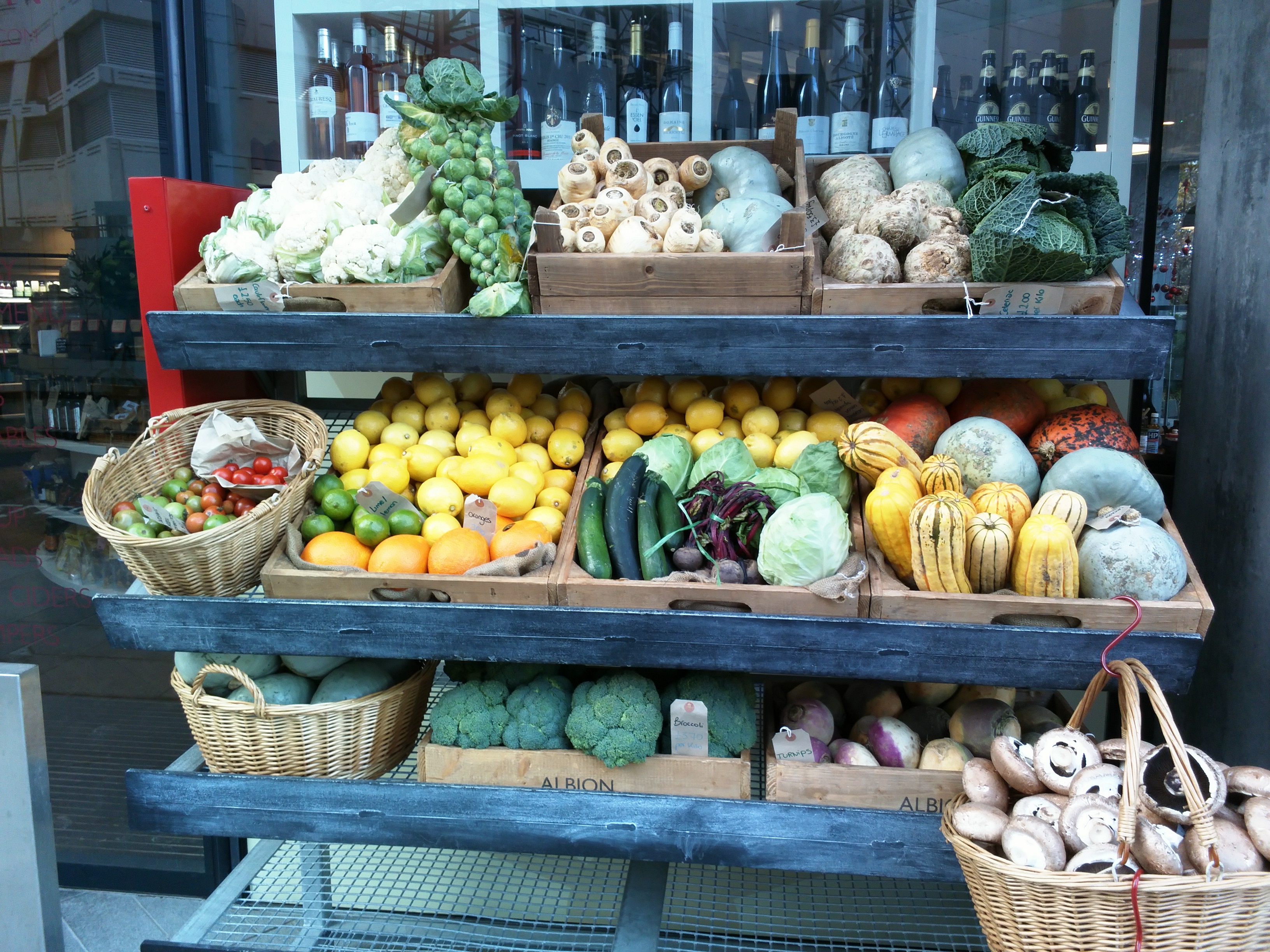 My first shot of this fruit and veg stand didn't particularly impress. There's sufficient detail, but the auto white balance hasn't done a brilliant job of reading the scene, resulting in a rather cold colour cast. Exposure isn't perfect either -- the cauliflower in the top left looks rather too bright.