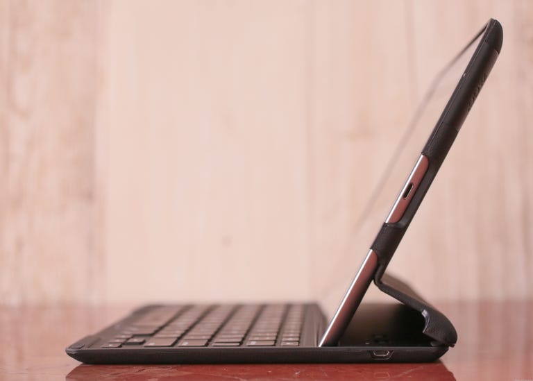 The ProFolio+ keyboard works pretty well, though, with enough spacing between the little square keys and each key offering enough key travel. There's no odd layout compression. I did produce a handful of repeated keys and mistyped characters, however, something I didn't experience on the Belkin or Logitech keyboards.