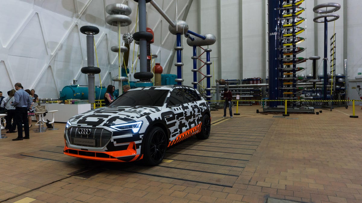 At the Siemens AG facility in Berlin, Germany, inside a room full of giant machines ripped straight from a '50s sci-fi epic, Audi kicked off the demonstration of its E-Tron EV in rather dramatic fashion: By shooting it with a bolt of lightning. With a flash of blue and a suitably menacing buzz, the bolt arced into the roof of the all-electric SUV prototype, which had been otherwise minding its own business, sitting demure in its camouflage.